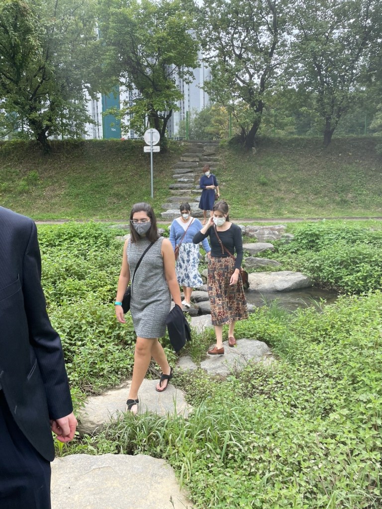 The next morning, we went to Cheongju Jeil Church, all wearing face masks and presenting our vaccination cards to enter. Due to Covid restrictions, the General Assembly Meeting was hosted in four different churches in the area so participants were socially distant but connected via a live feed. All the international mission workers, [Yuki Nagao (United Church of Christ in Japan); John Egger (United Church of Canada); Abigail Reed (Global Ministries) Kate Underwood and I (PC(USA)] and Hyeyoung Lee, our Korean site YAV coordinator, were introduced. Cameras were flashing as we bowed in respect. This meeting was recorded which made me a little nervous, but we were warmly received. While there, we witnessed Presbyterian history with the installation of Rev. EunKyoung Kim. She is the first female Moderator of the PROK.