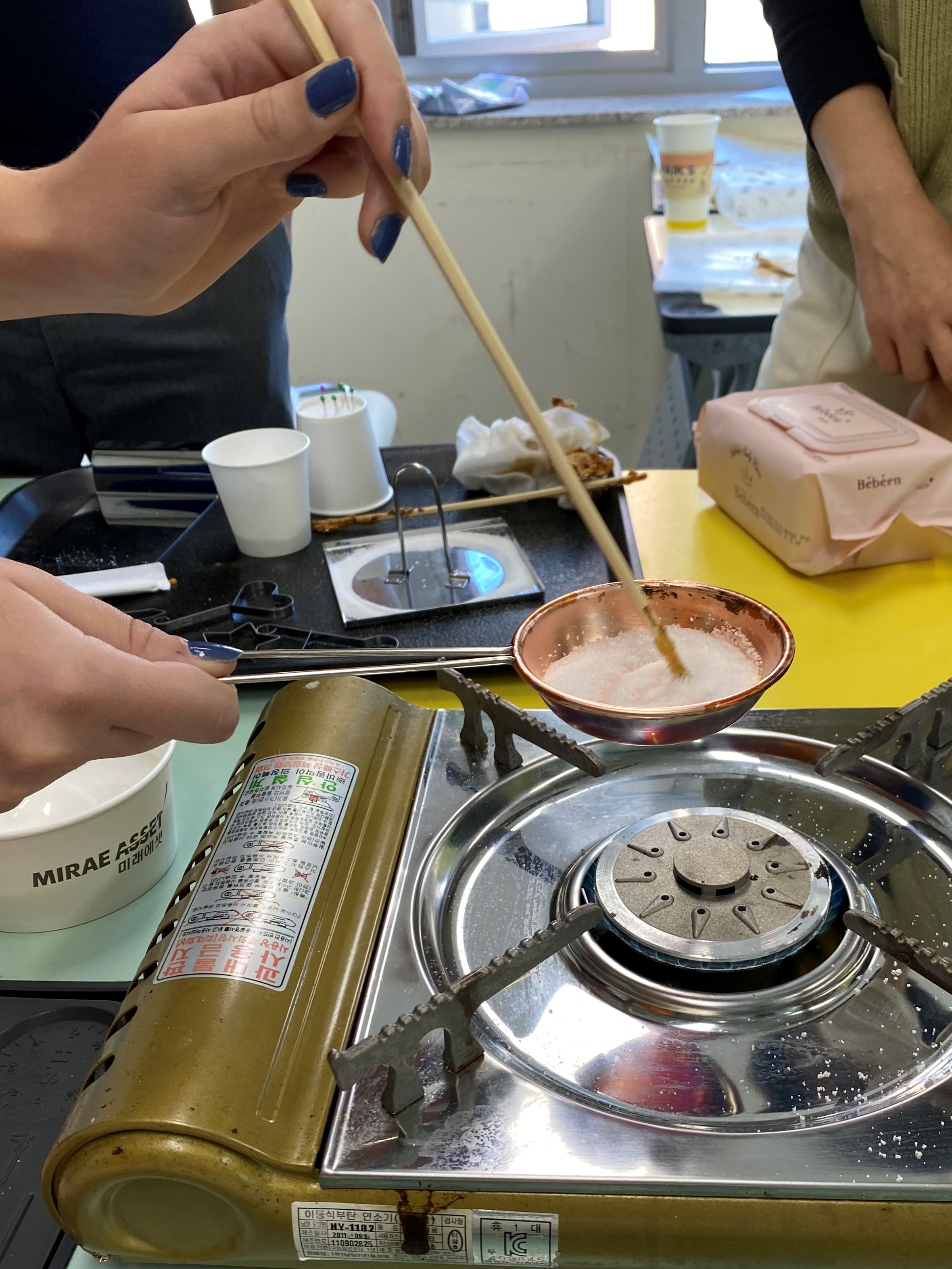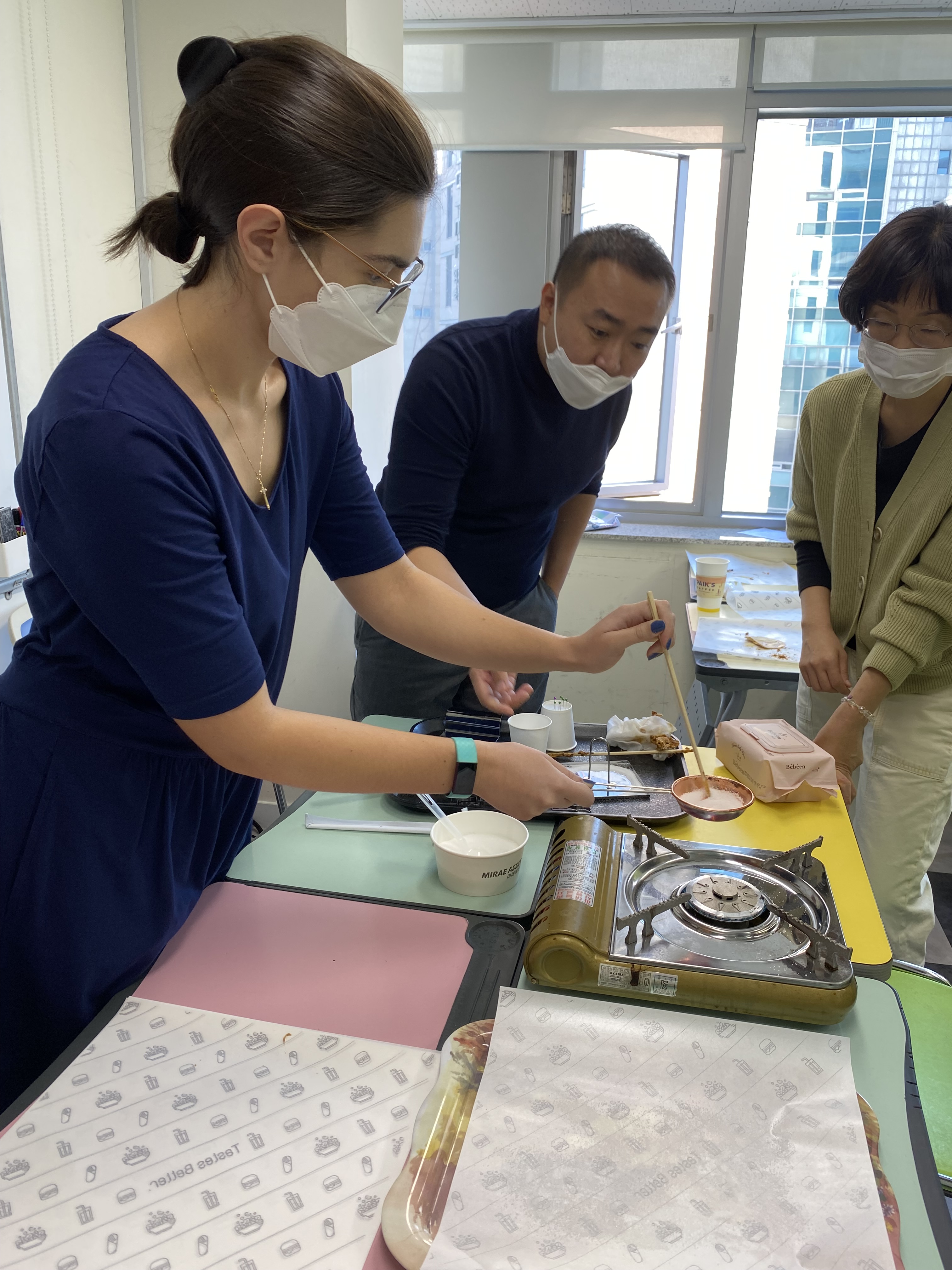 During the month of October, Kate and I went to Korean classes in an intensive language program. I learned so much and I am trying to communicate in Korean, but I have so much more to learn! We celebrated the end of our month of formal instruction by making Dalgona, a honeycomb toffee with a shape pressed into the sugar. A traditional game played by kids in Korea is to get the shape out without breaking the sugar candy (anyone seen Squid Game?). Afterwards, Reverend Kim, Mrs. Kim and Hyeyoung, took Kate and I on a field trip to an arboretum. Upon arrival, your temperature is checked and the government hotline is contacted to report your location (this is in case there is a COVID outbreak and contact tracing needs to be performed). Then we were allowed to walk around the park and observe the beautiful trees fall foliage. It was a wonderful opportunity to get out of the city and enjoy a perfectly gorgeous fall day. On our way home, we all went out for Korean barbeque.